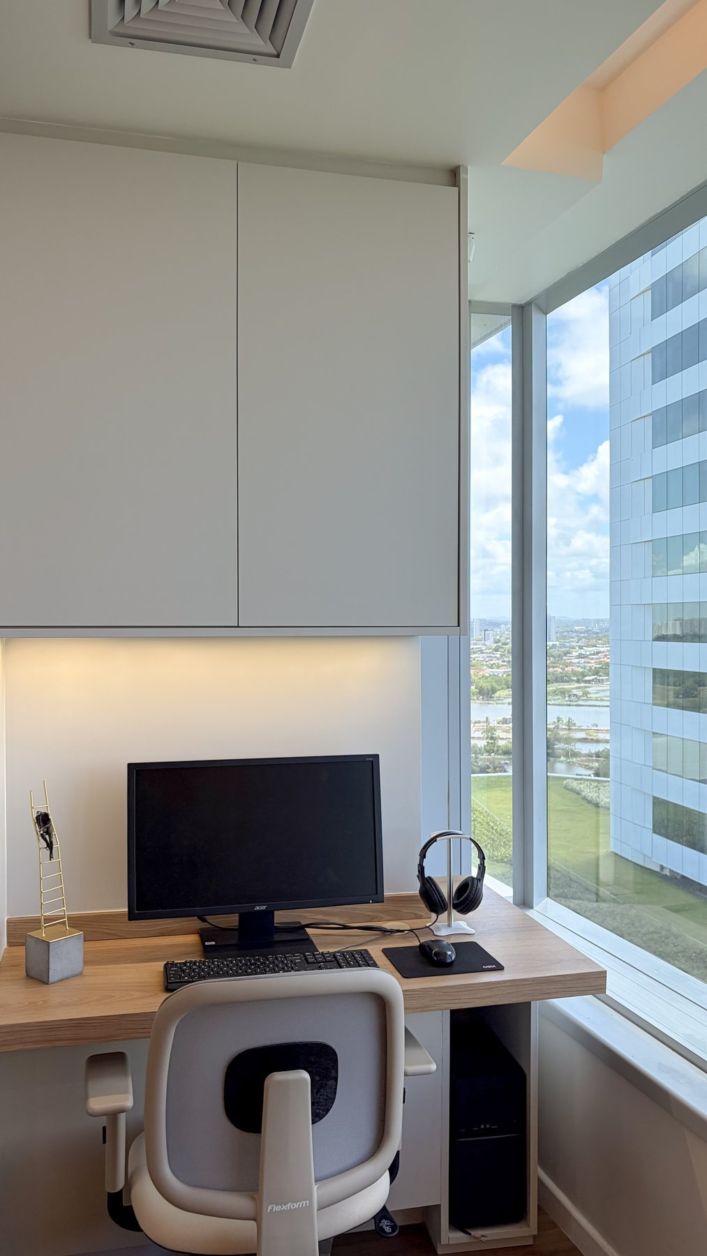 A joia desse projeto é, sem dúvida, a vista — muito bem aproveitada na sala de conferências, trazendo iluminação natural e transformando o exterior em um quadro vivo dentro do ambiente.