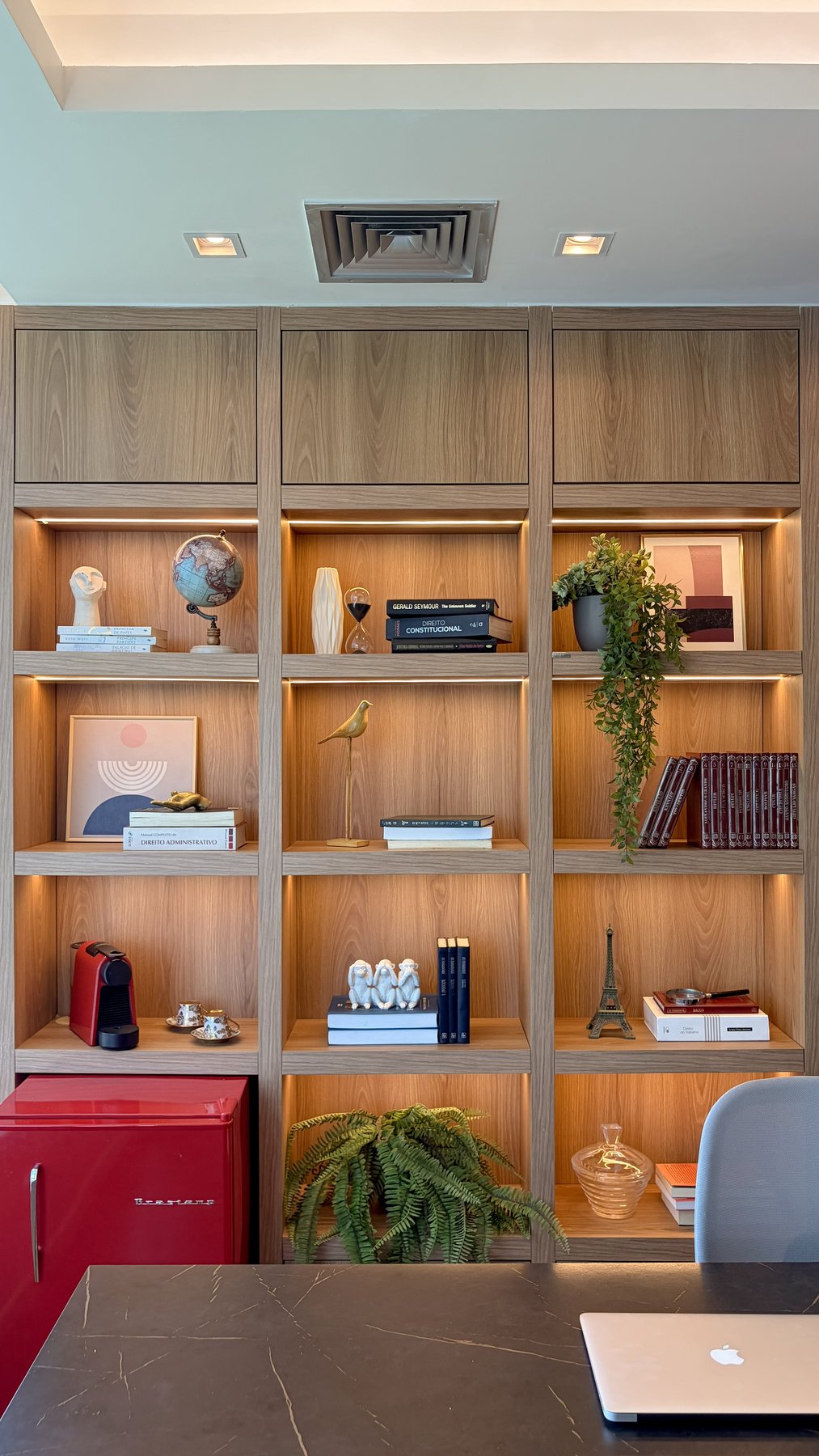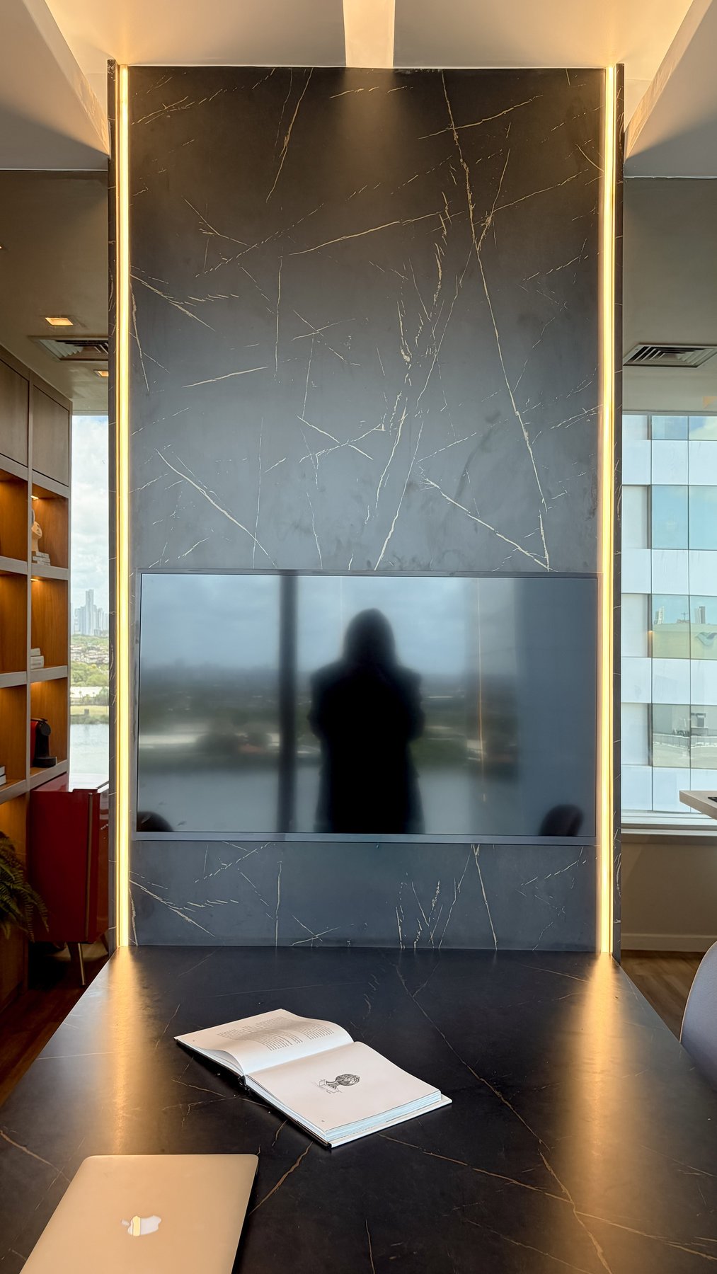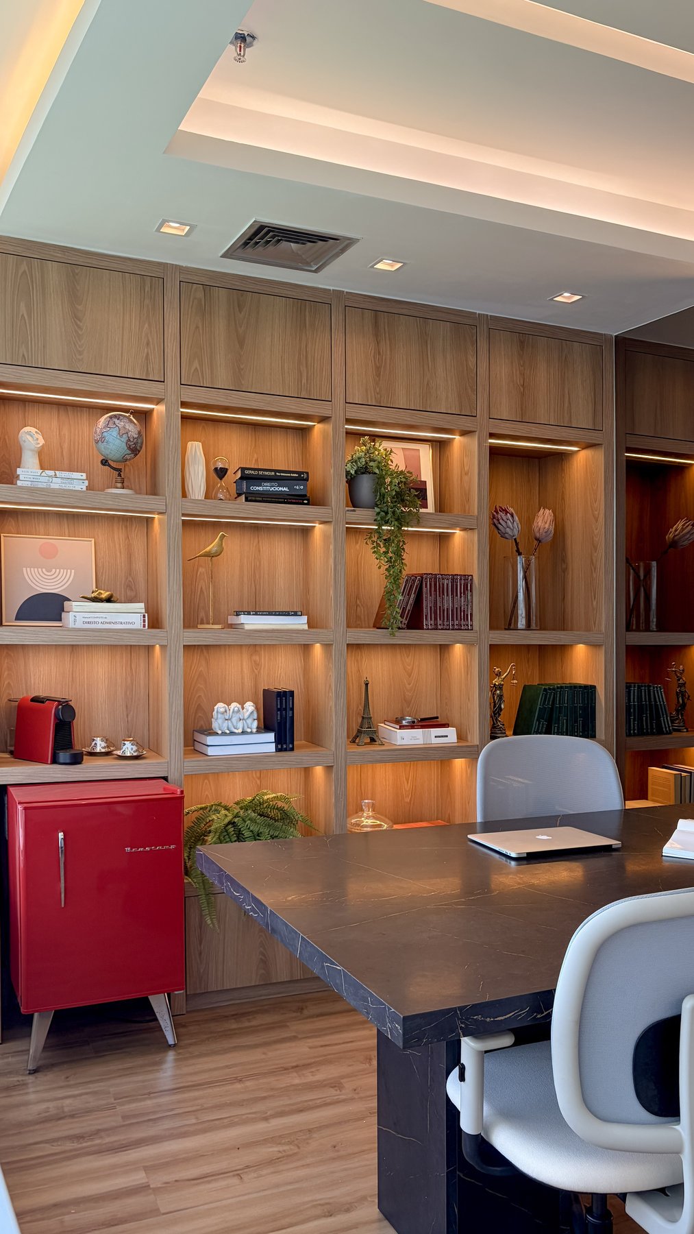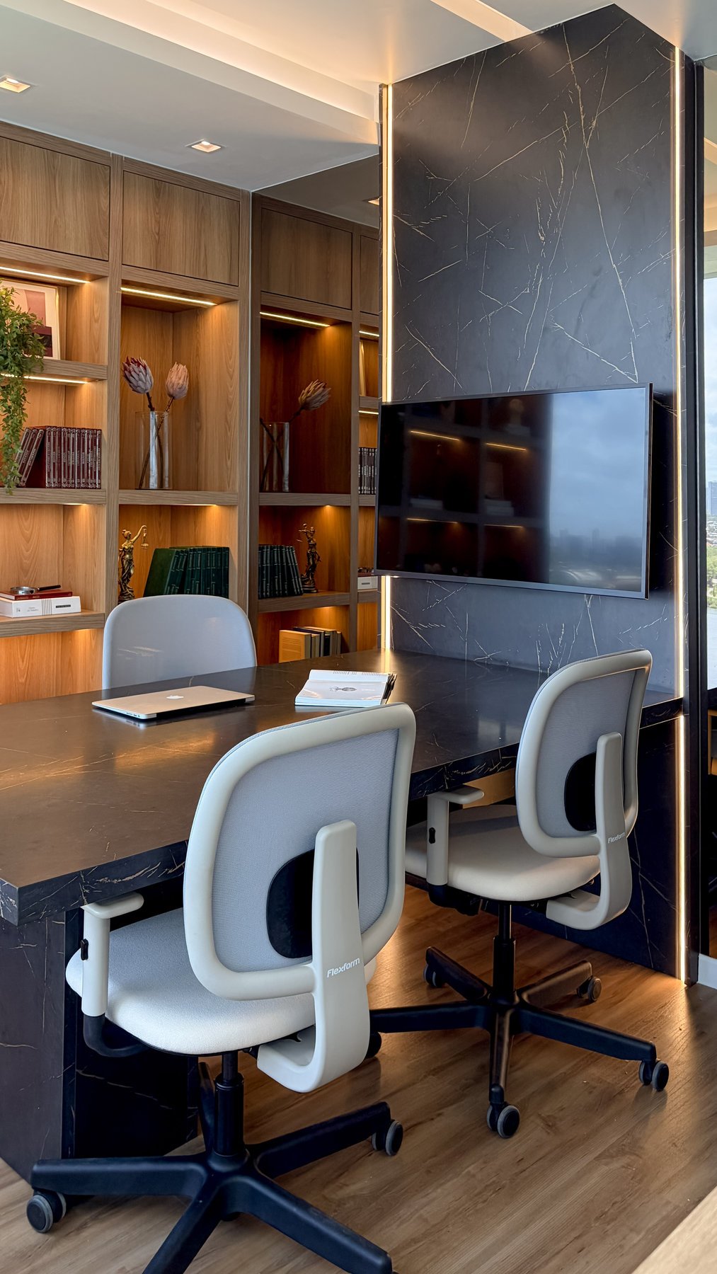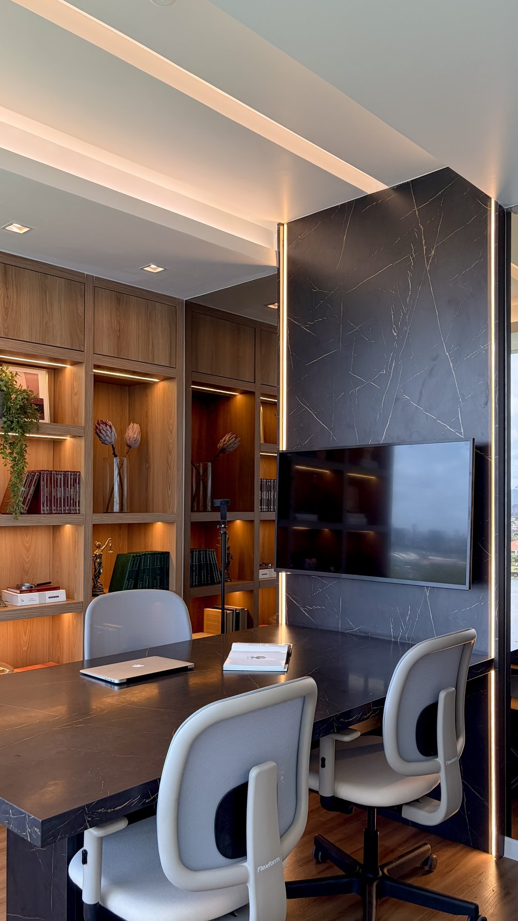 O projeto da sala BC foi especialmente interessante, porque chegou até nós como uma verdadeira tela em branco — o que nos deu liberdade total nas escolhas e na disposição dos ambientes.