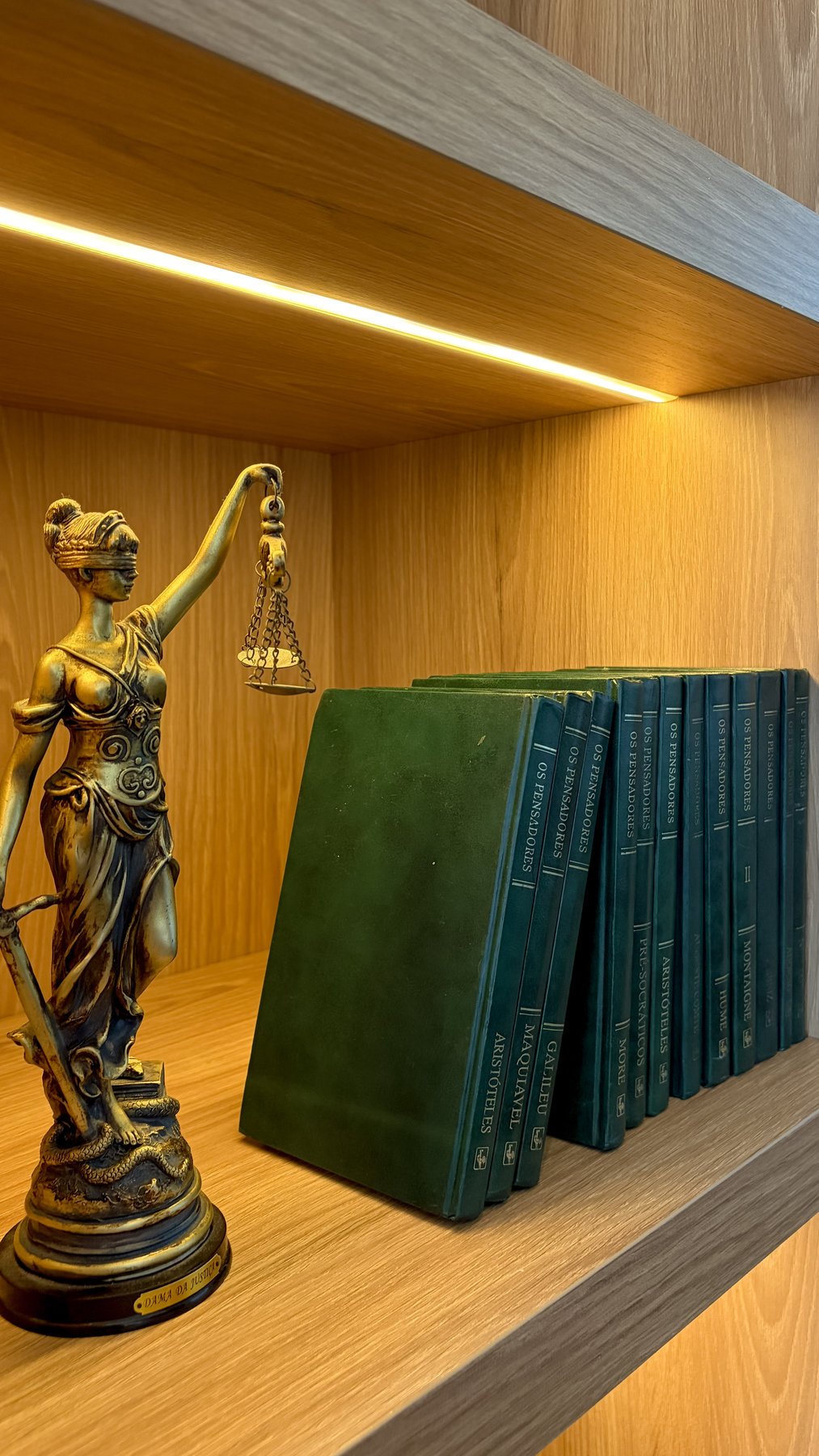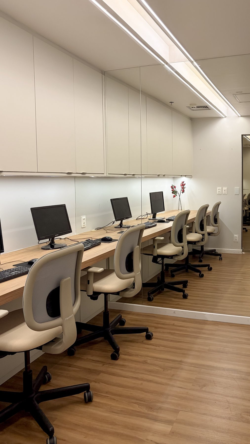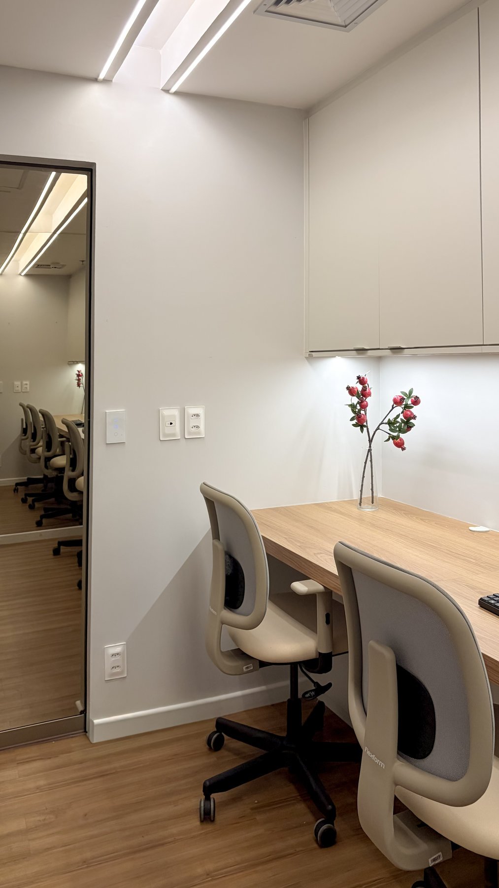 O escritório de advocacia conta com uma recepção revestida em espelhos, copa e lavabo, uma sala de ofício com três estações de trabalho e uma sala de conferências com mais uma estação.