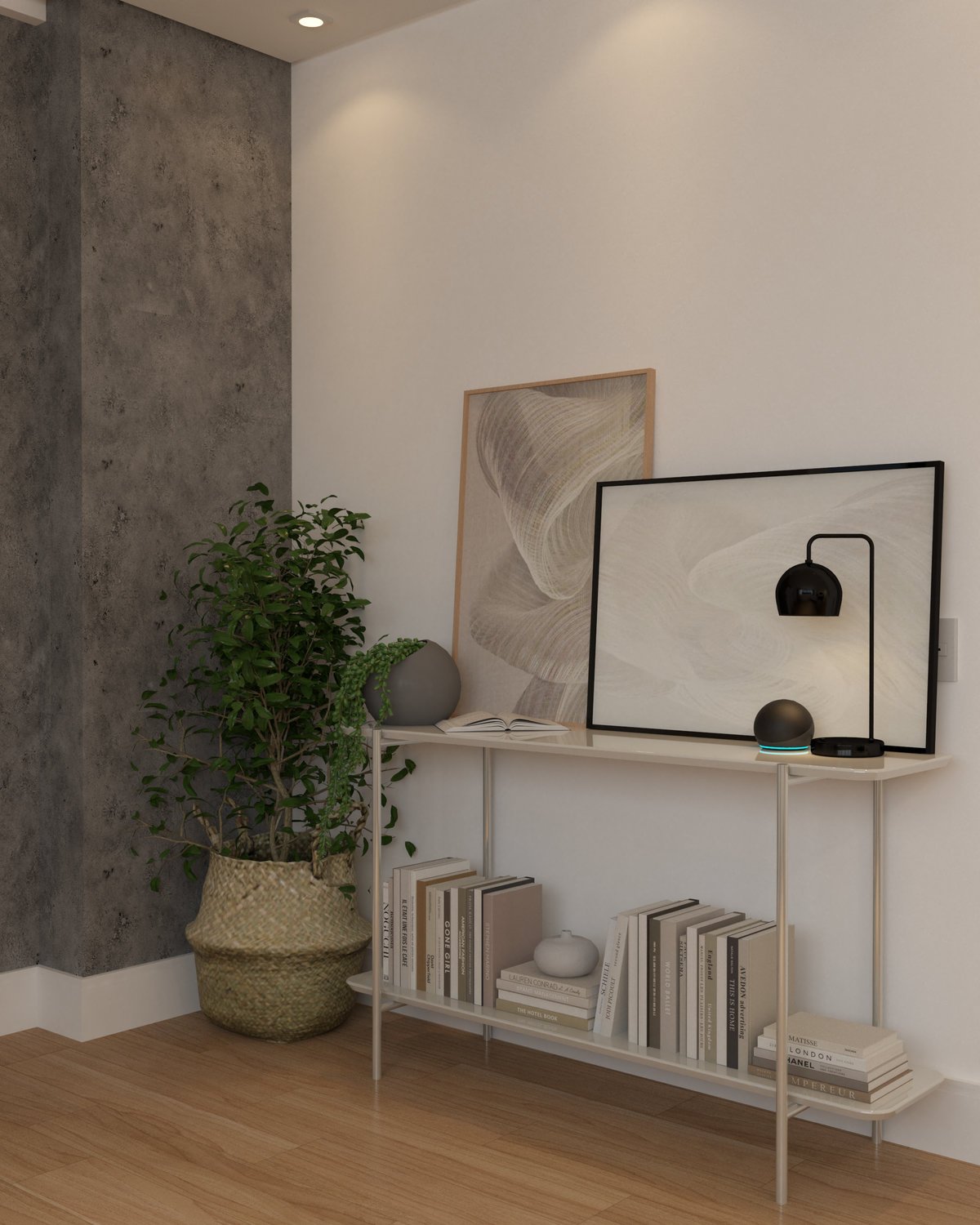 A paleta neutra com toques de verde traz equilíbrio e sofisticação, enquanto a madeira clara aquece o espaço. A iluminação, com pendentes em vidro e trilhos direcionáveis, valoriza os diferentes usos do ambiente.